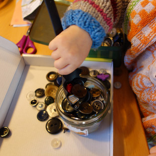 Hierbei bekommen die Kinder eine große Schachtel mit Knöpfen, eine Schöpfkelle und ein Tablett oder einen kleinen Karton bzw. ein Glas zum Umfüllen. Dies schult die Feinmotorik und Wahrnehmung sowie Konzentrationsfähigkeit der Kinder. Besonders beeindruckt hat mich die Hingabe, mit welcher meine kleine Tochter minutenlang die Knöpfe durch ihre Finger gleiten ließ ohne hinzuschauen. Sie wollte sie einfach nur spüren und zuhören, wie sie in das Glas fielen und war dabei hoch zufrieden.