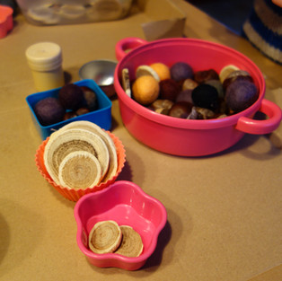 Verschiedene Materialien wie Filzkugeln, Holzscheibchen, Kastanien und Gardinenringe bilden die Grundlage dieser Aktion. Dazu habe ich den Kindern kleine Schachteln, Löffel und Zangen hingelegt und in kurzer Zeit waren sie vertieft in einem Spiel. Sie kochten Essen, bereiteten das Abendbrot für ihre Puppen vor und ganz nebenbei schulten sie durch das Greifen mit der Pinzette/ Zange, das Balancieren auf dem Löffel und das Einfüllen in kleine Gefäße ihre Feinmotorik.